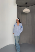 ÇİZGİLİ POLİN GÖMLEK BİYE ŞERİT DETAYLI - Mavi