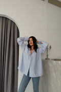 ÇİZGİLİ POPLİN GÖMLEK MANŞET İP DETAYLI - Mavi