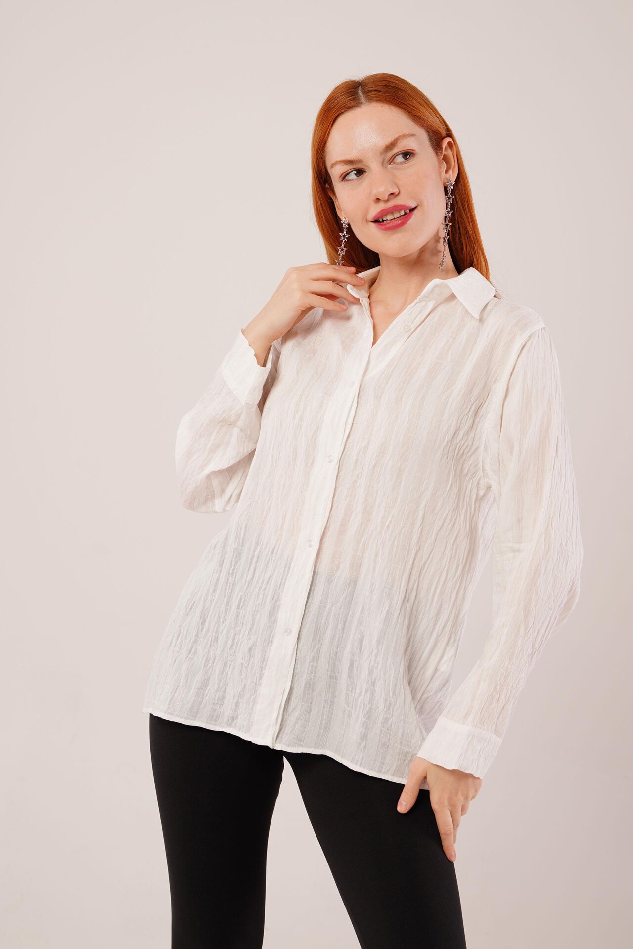 Düğmeli Ve Çizgi Detaylı Beyaz Gömlek
