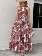 Kadın Halter Yakalı Omuzlardan Açık Kuşaklı Maksi Boy Desenli Süprem Elbise