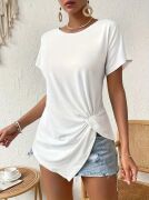 Kadın Kısa Kollu Asimetrik Kesim Bel Büzgü Düğüm Detay Viskon Bluz