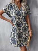 Kadın Kısa Kollu çentik Yaka çiçek Desenli Keten Elbise