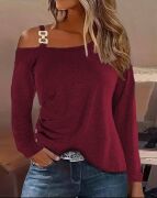 Kadın Uzun Kollu Tek Omuzu Açık Askılı Toka Ve Düğme Detaylı Yumuşak Bluz