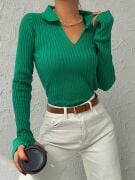 Kadın Yeşil Polo Yaka Parmak Detay Triko Bluz 2047