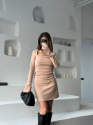 Kare Yaka Mını Boy Fitilli Elbise - Bej