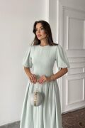 Mint Arkadan Bağlamalı Büzgülü Keten Elbise