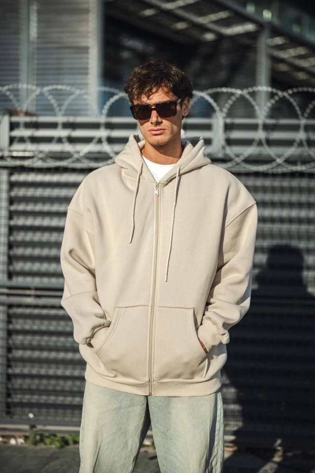 Oversize Tam Fermuarlı Uzun Kol Hırka - Bej